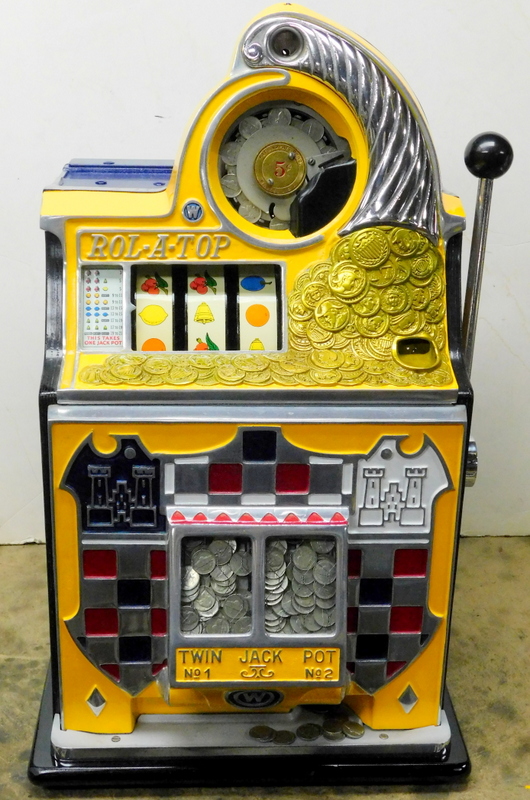 Watling 1947 Rol-A-Top "Checker Board" 5 cent. Previously restored, painted back to the original colors. New reel strips, original award card, original back door with lock and key, original cash box. Twin Jackpots.
