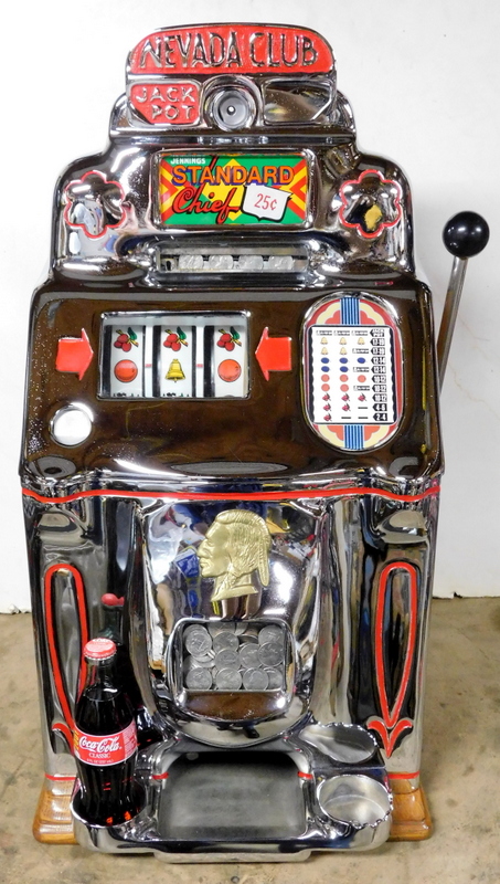1949 Jennings Standard Chief "Nevada Club" 25 cent with glass holder and ash tray, previously restored. Chrome plated 9.9 out of a 10. This is the way we received this machine from a previous owner that was downsizing. Mint condition award card, reel strips, marquee. Working automatic Jackpot with reserve. Very nice back door and lock with one key, original oak cabinet in mint condition, new cash box. Plays very easy and pays as it should.