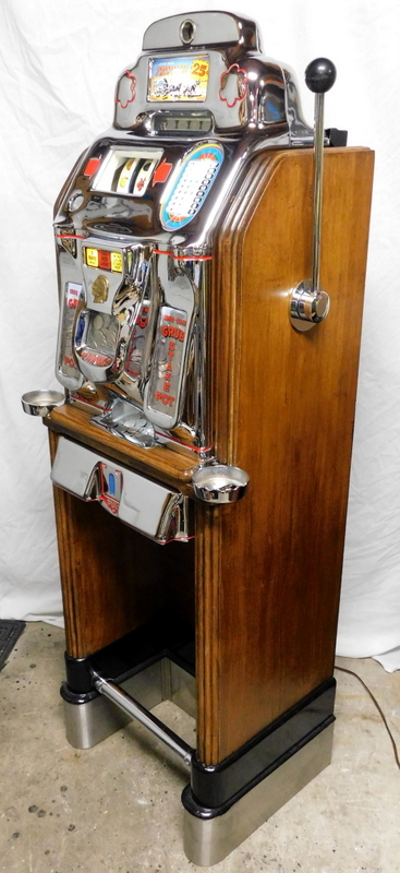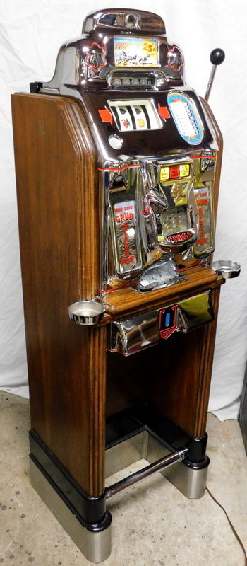 1948 Jennings "Prospector" console, 25 cent, previously restored. This is the most sought after Jennings machine ever made next to the dollar model Prospector. The chrome on the machine is a 9.9 out of 10, Number matching, Has the original paper work on the inside. The console cabinet is also in mint condition. Working Jackpot with reserve, large cash box, ash try and drink holder. Plays and pays as it should.