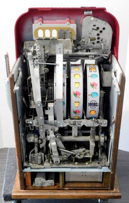 Mills 1948 Bonus Hi-Top 25 cent with the Hard to find Bonus feature. "Older Restoration" restored back to the colors of maroon, Gold, trimed in wrinkle Green. Very nice original oak stained cabinet, jackpot with reserve, new original award card, original cash box, original back door, original Mills lock with one key. The only thing that is not original on this machine is reel strips and paint