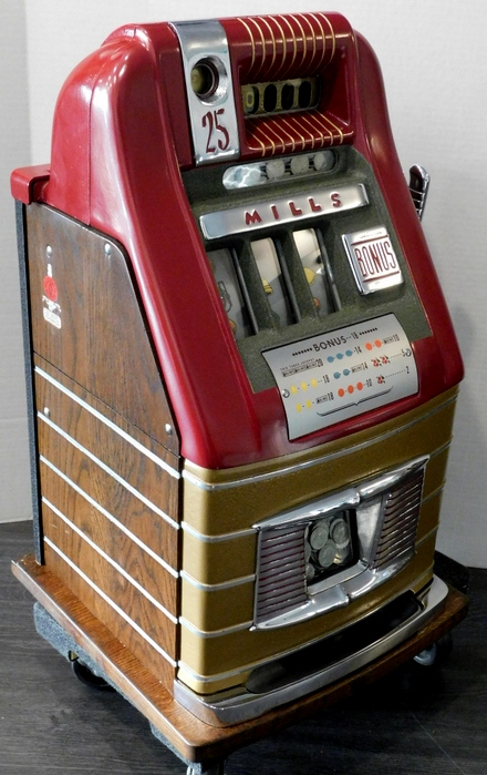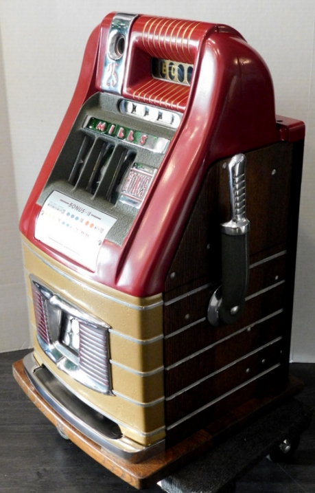 Mills 1948 Bonus Hi-Top 25 cent with the Hard to find Bonus feature. "Older Restoration" restored back to the colors of maroon, Gold, trimed in wrinkle Green. Very nice original oak stained cabinet, jackpot with reserve, new original award card, original cash box, original back door, original Mills lock with one key. The only thing that is not original on this machine is reel strips and paint