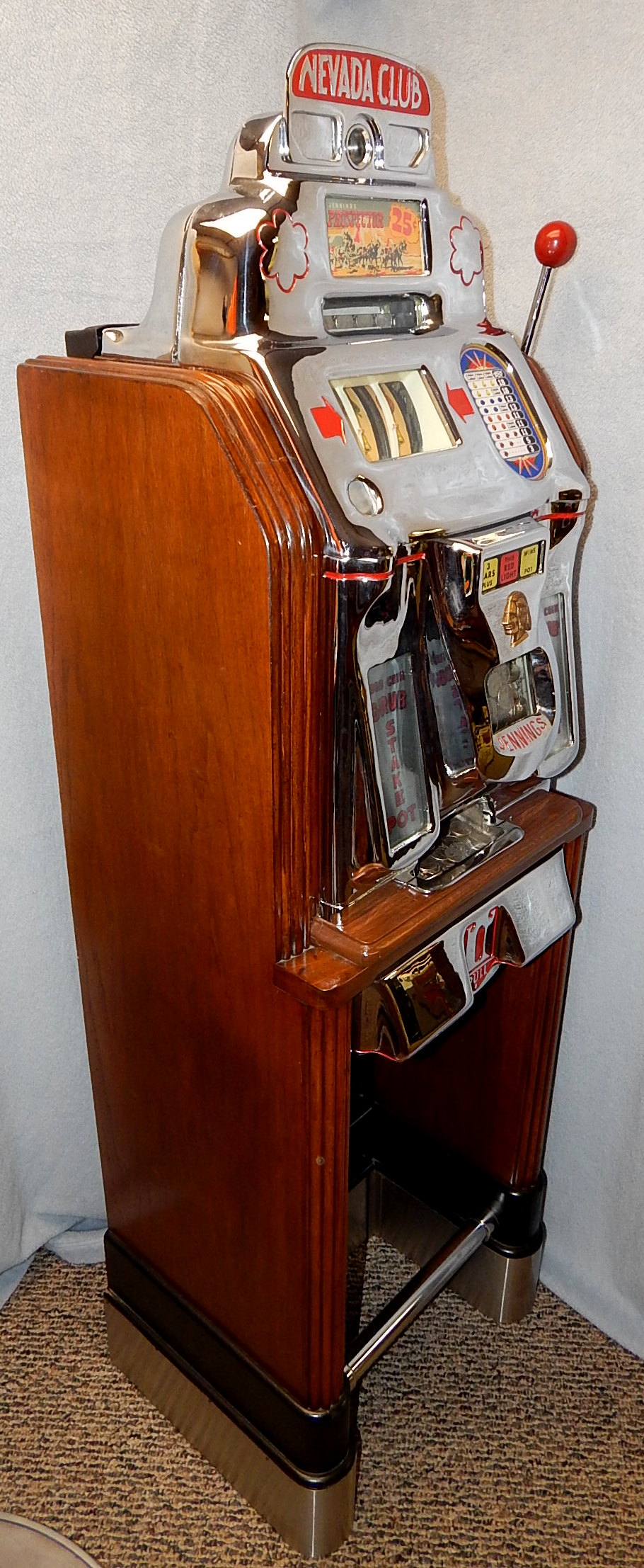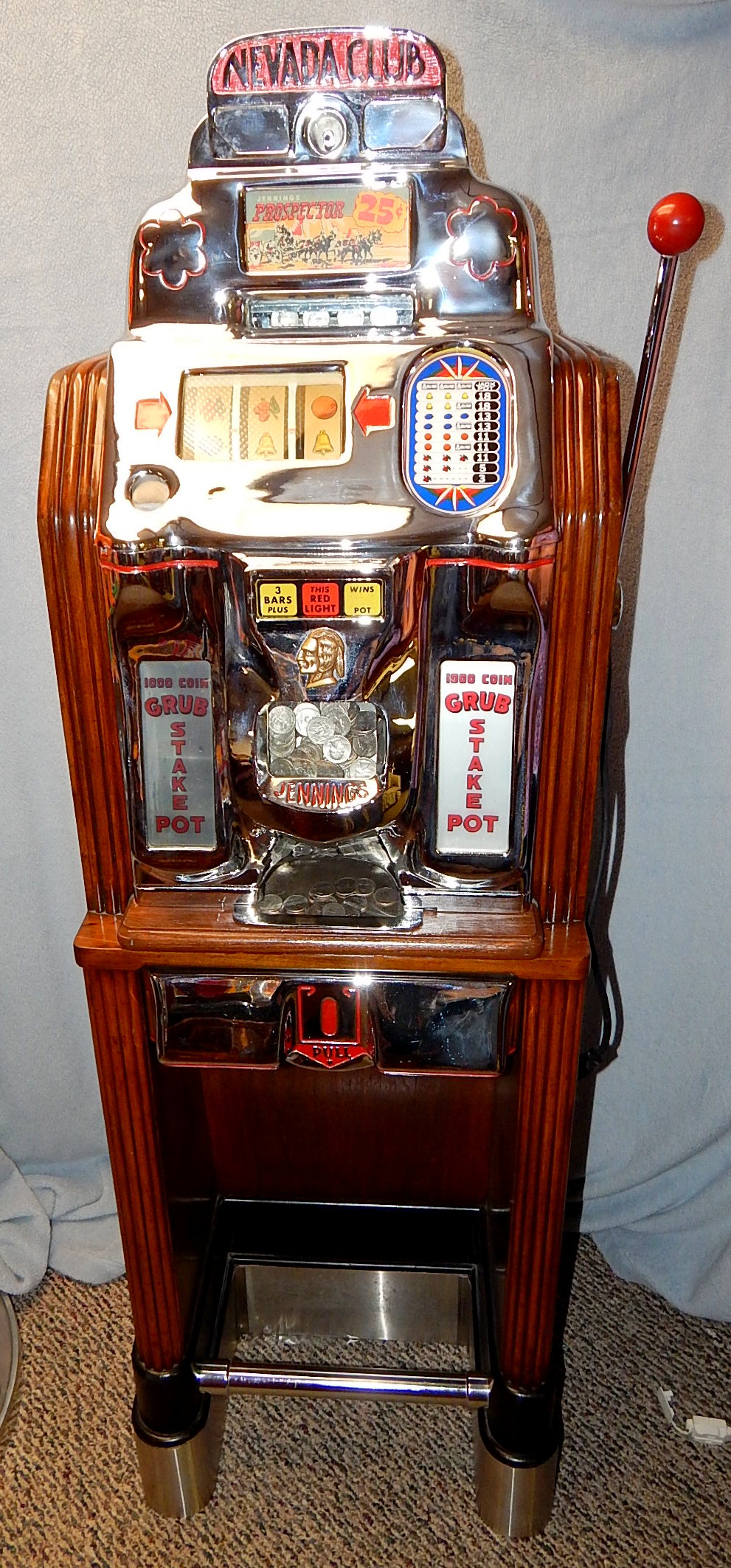1948 Jennings " Nevada Club Prospector" console, 25 cent, restored. This is the most sought after Jennings machine ever made next to the dollar model Prospector. The chrome on the machine is a 9.9 out of 10 The console cabinet is also in mint condition. Working Jackpot with reserve, large cash box. Plays easy and pays as it should.